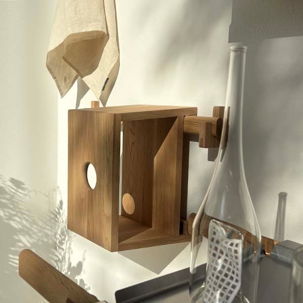 このフックを起点に、バー、プレート、ボックス、ドロワーなどを自由に組み合わせることで、ウォールシェルフ、キャビネット、ワゴン、テーブルなど、さまざまな形に発展させることができます。