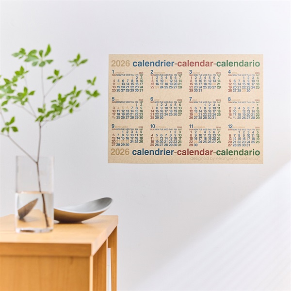 文字色は、日曜日がレッド、祝祭日がイエロー、土曜日がグリーン、平日がブルーと、ひと目でわかるカラースキーム。風合いのある用紙を使用し、紙の質感そのものがインテリアの一部に。壁に貼ってポスターのように飾るのはもちろん、デスクマットとしてもお使いいただけます。シンプルで実用的でありながら、空間に彩りを添える1枚です。