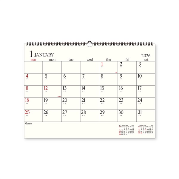 2026年1月から12月まで使える、落ち着いた印象の壁掛けカレンダー。アイボリーの紙に、グレーとレッドの2色で構成されたミニマルなデザインが魅力です。日曜・祝日はレッド、平日・土曜はグレーで印字され、視認性と上品さを両立。