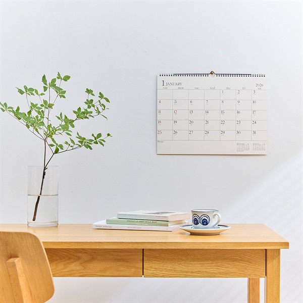 当月前後のミニカレンダー、日本語表記の祝日、六曜も記載されており、実用性にも優れています。ダブルリング仕様でめくりやすく、壁掛けとして長く美しくお使いいただけます。シンプルながらも暮らしに穏やかに寄り添う、毎日にちょうどいいデザインです。