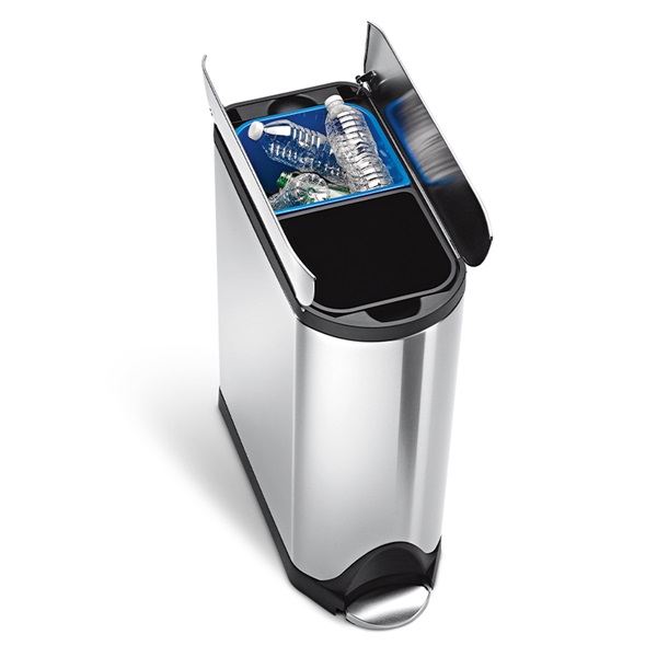日常使いに最適なサイズです。シンプルヒューマンのバタフライステップカン/リサイクラー40Lは、分別機能が付いたステンレス製ゴミ箱。両手がふさがっていても使えるフットペダル機能。持ち運びしやすい軽量で、便利な手がかりもあります。中央から静かに垂直に開くバタフライ式のフタは、カウンター下など高さの限られた場所でも使いやすく、キッチンに自然と馴染みます。静音クローズ機能により、毎日の家事をより快適にします。