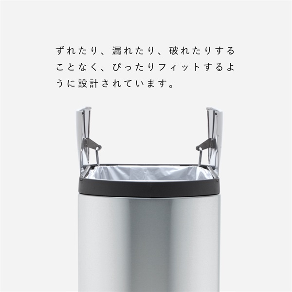 中央から垂直に跳ね上がる構造で、上部クリアランスが少ない場所でも開閉しやすい設計。90度まで開き、ロック機能を使えば開いたまま固定でき、ゴミ袋の交換もスムーズ。