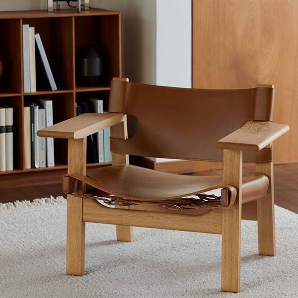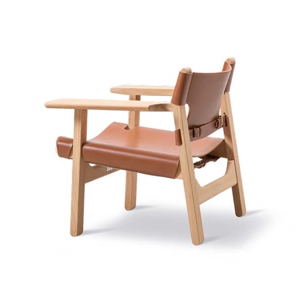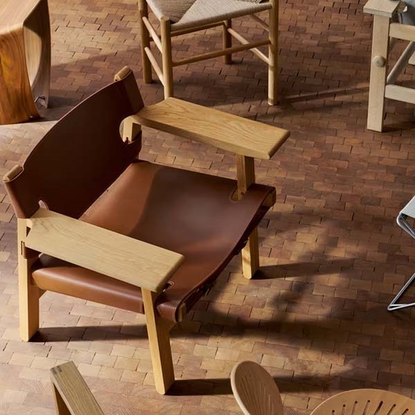 アイコニックな存在として知られるスパニッシュチェアは、1958年にボーエ・モーエンセンがフレデリシアのためにデザインした、モダンデザインを象徴する代表作です。家族で訪れたアンダルシアで目にした、スペイン中世様式の椅子から着想を得て誕生したこのデザインは、幅広のアームレストを備えた伝統的なスタイルを、モーエンセンが掲げた「形態は機能に従う」という理念のもと現代的に再解釈したもの。過度な装飾を排し、無垢のオーク材またはウォルナットに最高品質のサドルレザーを組み合わせた、力強くもミニマルな構造へと昇華させました。1958年のコペンハーゲン家具職人ギルド展では、床からテーブルを取り払った開放的なリビング空間の中心に配置され、幅広のアームが生み出す“くつろぎと会話のための場”が高く評価されました。無垢材の存在感と、使い込むほどに深みを増すサドルレザー。スパニッシュチェアは、モーエンセンの思想が色濃く宿る、普遍性と機能美を兼ね備えた北欧家具の象徴として、今も世界中で愛されています。
