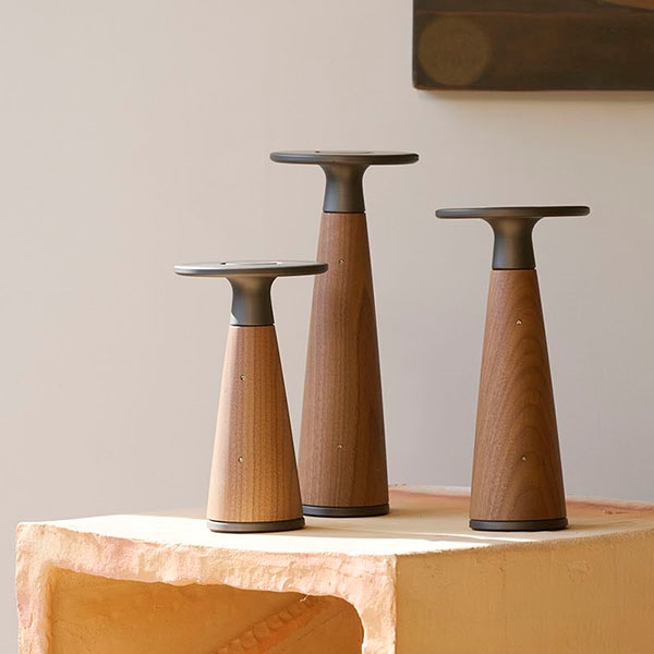 用途やシーンに合わせて、中心の木の部分を大・中・小の3つのサイズに切り替えられるほか、メープル、ウォルナットの2種類の木材から選ぶことができ、長く使い続ける中で交換することも可能です。暮らしの変化に合わせてかたちを変えながら、長く愛用できるデザイン。Voscoは、使い手の時間とともに育つ照明として、心地よい光を届け続けます。