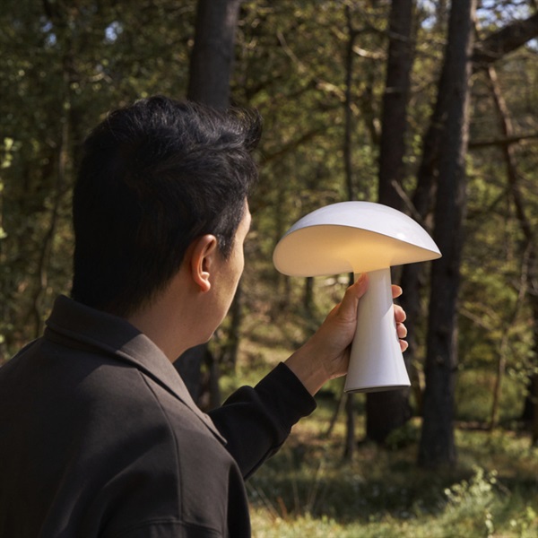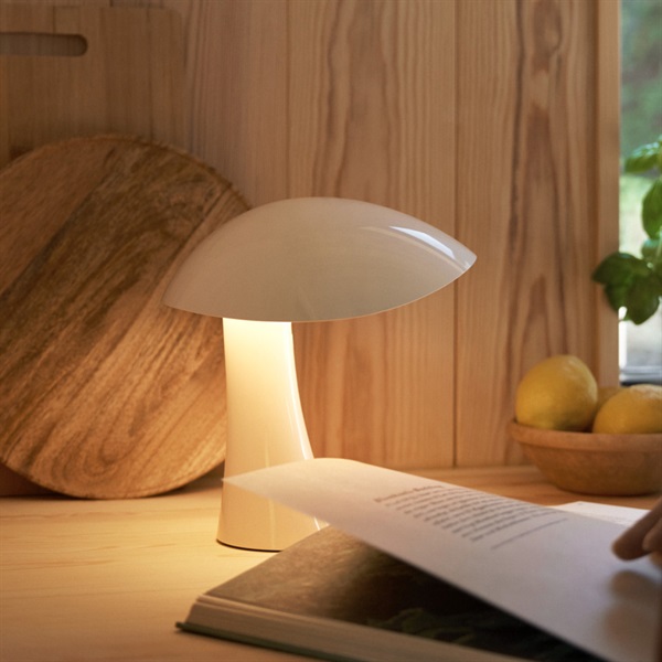 シンガポールとポルトガルを拠点に活動するデザイナー、ガブリエル・タンによってデザインされたポータブルランプ「Rumee(ルーミー)」。その名は、デンマーク語で「部屋」を意味するrumと、英語のme(私)を組み合わせた造語です。まるで一緒に暮らす仲間のように、日々の暮らしに寄り添います。アシンメトリーで有機的なフォルムのシェードが、光を自然に受け流し、つばの広い側へ向かってやわらかな光が広がります。