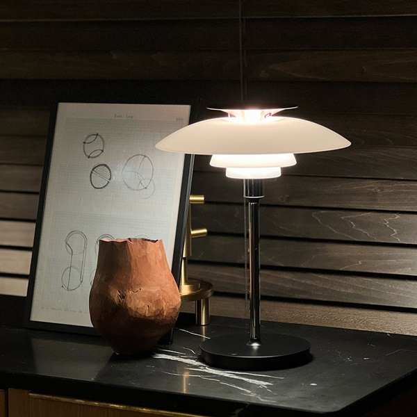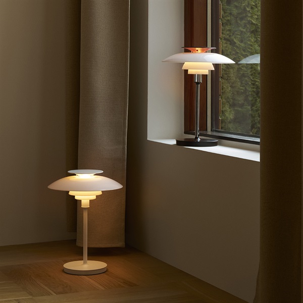 4段階のステップ調光と長押しによる無段階調光に対応し、「ディムトゥウォーム機能」で光量を落とすとキャンドルのように温かみのある光へ変化。消灯・点灯時に2回早押しするだけで調光モードを切り替えられ、シーンに合わせて自在に明るさを調整できます。アルミダイキャスト製のマットなトップリフレクターと乳白色アクリルシェードが、空間をやさしく包み込みます。カラーはモダンな「シルヴァー・クローム」と柔らかな印象の「ホワイト」の2色。名作の光を、どこへでも。PH80ポータブルが、暮らしに上質な灯りをもたらします。
