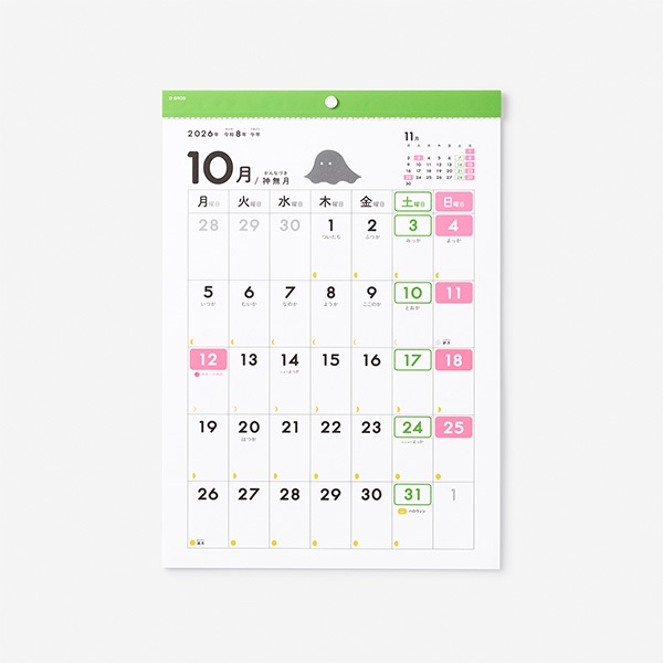 学校生活のリズムに合わせて、月曜日始まりになっています。⾏事に合わせたシール、⽉の満ち⽋けなど、カレンダーを通して学校⽣活のリズムを⾝につけることができます。行事や習い事、お友達との約束などの予定を書き込むスペースも大きめに。⽇にちには⼩さくふりがなが振られています。和⾵⽉名⼊りなので⽇本の暦も⾃然と覚えられます。