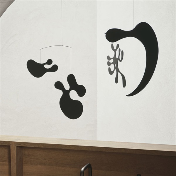 1940年代初頭、チャールズ&レイ・イームズ夫妻は成形合板の可能性を追求するため、数多くの実験を重ねました。その過程で誕生したのが「イームズ プライウッド モビール」です。ロサンゼルスの自邸の天井にも吊るされていたこのモビールは、レイ・イームズのアートワークやグラフィックを思わせる有機的なフォルムが特徴。2枚のプライウッドが軽やかに揺れ、回転しながら空間に遊び心と動きを添えます。緩やかなカーブと木材ならではの質感が、風や空気の流れに合わせて柔らかな印象を広げ、インテリアに癒しをもたらします。木目は一点ごとに異なり、自然素材ならではの個性をお楽しみいただけます。バリエーションは「モデルAL」と「モデルC」の2種類。カラーはブラックとアイスグレーからお選びいただけます。環境に配慮した水性ラッカー塗装仕上げです。