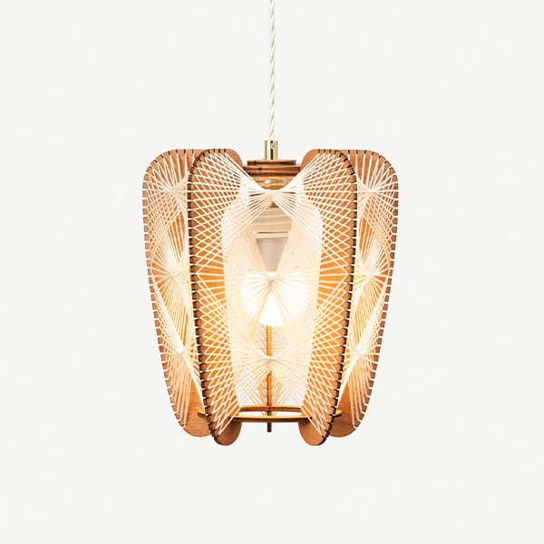 幾重にもスリットが入った厚さ5mmの薄板に、幾重にも張り巡らされた細いロープ。温かみのある素材感とシンプルな構成ながらも、独創的でクールな表情を見せるLAFABLIGHT(ラファブライト)。1950~60年代に北欧で作られていた、木枠に紐を巻き付けたランプシェードからインスパイアされ、ヴィンテージのエッセンスを残しつつ現代の空間に合うようフォルムの試作を繰り返し誕生しました。メイド・イン・フランスにこだわり、素材はパリから西に200キロほど離れた森に生息するナラ、ポプラ、ブナなどの木々から製材。絶妙なテンションを調整しながら組み上げていく必要があるため、組み立てや糸の編み上げに関しては、フランス国内の家具工房が一つ一つ手作業で丁寧に仕上げています。照明を点けた時と、消した時でシルエットが変化し、さらに見る角度によってさまざまな表情を見せてくれるのも特徴です。