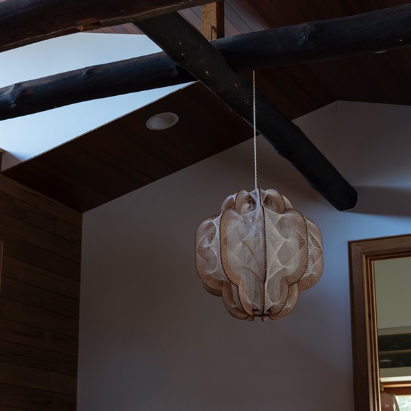 幾重にも張り巡らされた細いロープが美しいLAFABLIGHTの照明。これは1950〜60年代に北欧で作られていた、木枠に紐を巻き付けたランプシェードからインスパイアを受けています。ヴィンテージのエッセンスを残しつつ、現代の空間に馴染むよう試作を繰り返しながら形になっているのです。