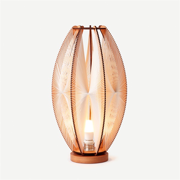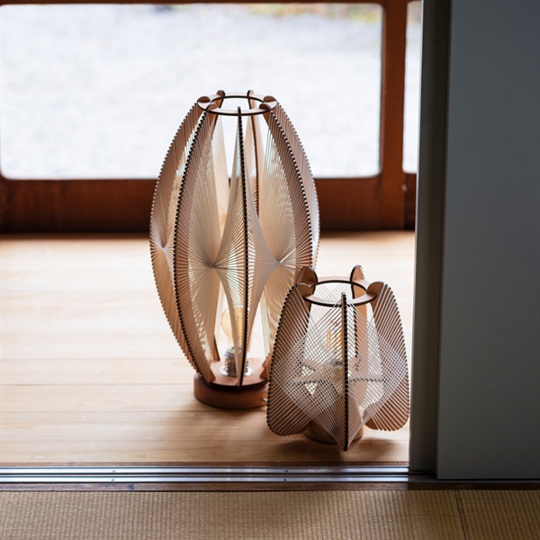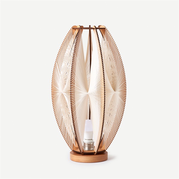 オブジェようなベースランプ。厚さ5mmの薄板に細やかなスリットを施し、そこに細いロープを張り巡らせることで、温もりと緊張感を併せ持つ独創的なデザインを実現しました。デザインソースは1950〜60年代の北欧ランプシェード。木枠に紐を巻き付けて作られた当時のプロダクトから着想を得つつ、現代の空間に調和するフォルムへと進化させています。素材には、パリから西へ約200kmに位置する森で育ったナラ、ポプラ、ブナなどを使用。組み立てやロープの編み上げは、フランス国内の家具工房により一点ずつ丁寧に手作業で仕上げられています。