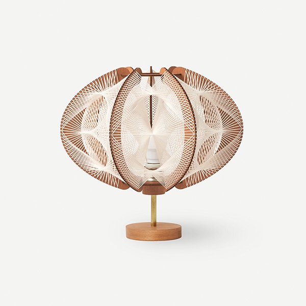 小ぶりで愛らしいフォルムが魅力のテーブルランプ。厚さ5mmの薄板に細やかなスリットを施し、そこに細いロープを張り巡らせることで、温もりと緊張感を併せ持つ独創的なデザインを実現しました。デザインソースは1950〜60年代の北欧ランプシェード。木枠に紐を巻き付けて作られた当時のプロダクトから着想を得つつ、現代の空間に調和するフォルムへと進化させています。