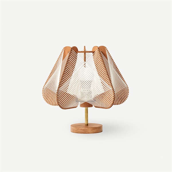 小ぶりで愛らしいフォルムが魅力のテーブルランプ。厚さ5mmの薄板に細やかなスリットを施し、そこに細いロープを張り巡らせることで、温もりと緊張感を併せ持つ独創的なデザインを実現しました。デザインソースは1950〜60年代の北欧ランプシェード。木枠に紐を巻き付けて作られた当時のプロダクトから着想を得つつ、現代の空間に調和するフォルムへと進化させています。